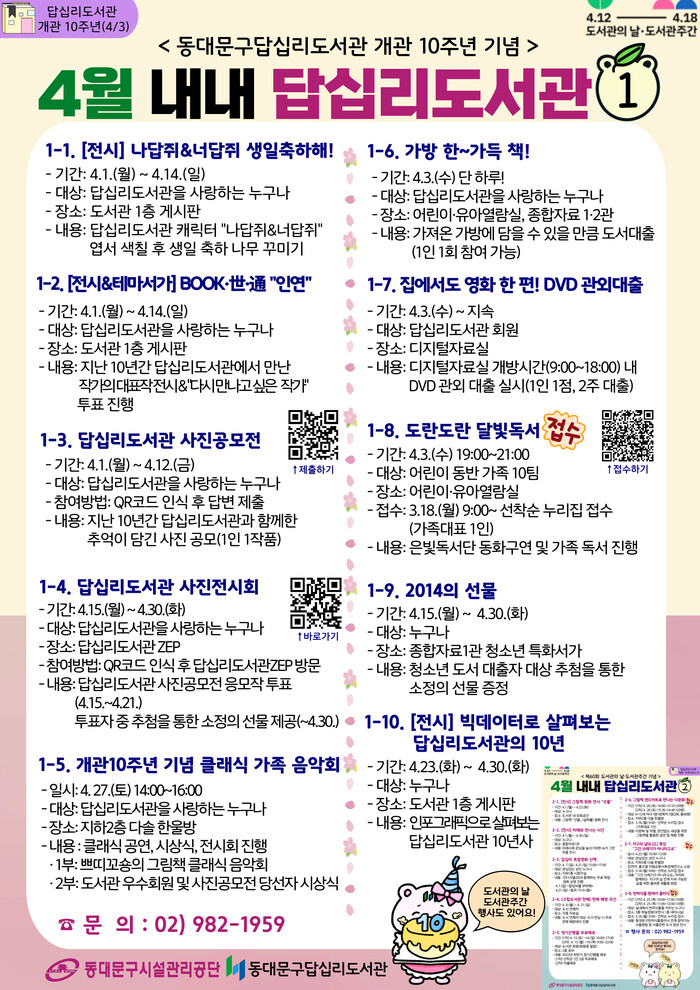 [시민일보 = 이대우 기자] 동대문구시설관리공단에서 운영하는 동대문구답십리도서관이 개관 10주년을 맞이하여 4월 한 달간 지역주민을 대상으로 풍성한 독서문화행사를 진행한다.