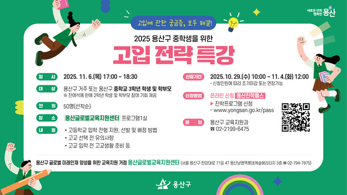 ‘중학생을 위한 고입 전략 특강’은 오는 6일 오후 5시 용산글로벌교육지원센터(한강대로71길 47, 3층)에서 열린다. 참가 대상은 구에 거주하거나 지역내 학교에 재학 중인 중학교 3학년 학생과 학부모 50명이다.