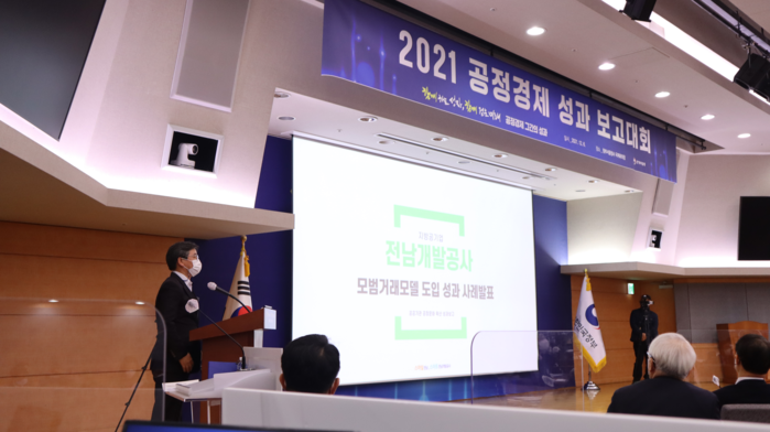 | ▲ 전남개발공사는 지난6일 5개 부처가 주최한 ‘공정경제 성과 보고대회’에서 모범거래 대표 선도기관으로 선정되어 우수 사례를 발표했다.(출처=전남개발공사) |