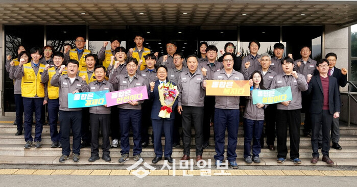 [광주=정찬남 기자] 강기정 광주광역시장(사진 앞줄 왼 쪽부터 네 번째)이 6일 금호타이어 곡성공장을 방문해 노사 관계자들과 간담회를 갖고 ‘광주전남통합 특별법’ 국회 통과와 관련해 환담을 나눈뒤 기념촬영을 하고 있다. /광주광역시 제공