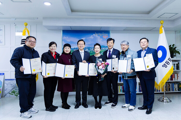 영등포구는 11일 구청장실에서 2024년 통·반장 활동 유공 표창 수여식을 진행했다. 사진은 표창 수여식에 참석한 최호권 구청장(왼쪽)이 유공자들과 기념촬영을 하고 있는 모습. (사진=영등포구청 제공)