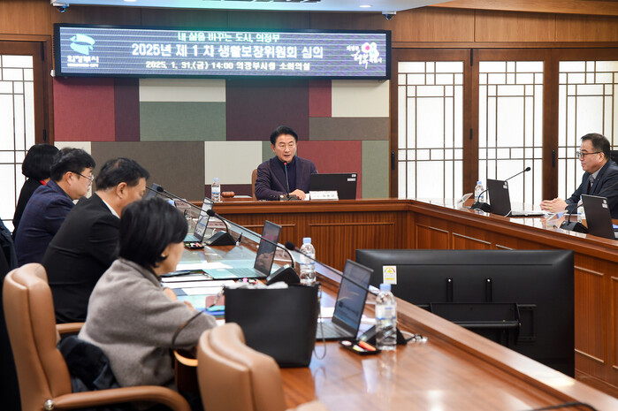 경기 의정부시가 최근 국민기초생활보장 연간 조사계획과 자활지원계획을 비롯해 저소득층의 생활 안정에 관한 사항을 다루고자 시청 소회의실에서 ‘2025년 제1차 생활보장위원회’를 개최했다. 이번 위원회에서는 긴급복지 지원 적정성 및 연장 승인 등 19건, 가족관계 해체 등에 관한 사항 35건이 심의ㆍ의결됐다. 사진은 김동근 시장(가운데)이 회의를 진행하는 모습. (사진=의정부시청 제공)