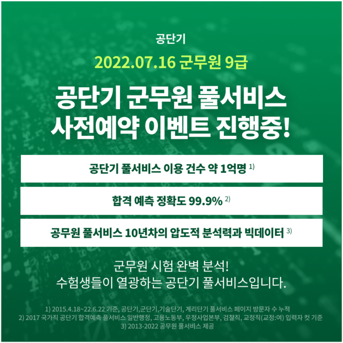 2022 군무원 9급 시험 합격예측 풀서비스 신청 및 이벤트에 대한 자세한 사항은 공단기 홈페이지에서 확인 가능하며, 사전 예약 이벤트는 시험 당일인 16일 오후 2시까지 운영된다.