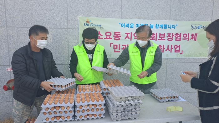 경기 동두천시 소요동 지역사회보장협의체는 최근 고독사 예방을 위해 홀몸노인과 정신질환자 등 고위험 중장년 나홀로 가정을 방문해 영양계란을 전달하며 생활환경을 점검했다. 사진은 협의체 관계자들이 전달할 영양계란을 포장하고 있는 모습. (사진제공=동두천시청)