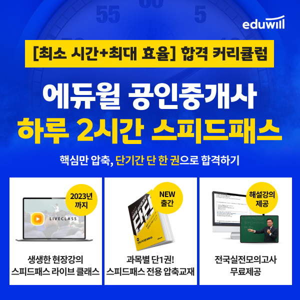 [시민일보 = 이창훈 기자] 에듀윌 공인중개사는 충분한 공부 시간 확보가 어려운 수험생을 위해 ‘하루 2시간 스피드패스’를 운영한다고 밝혔다.