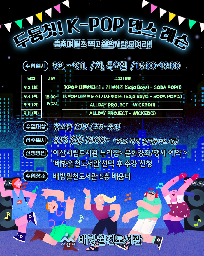[아산=박명수 기자] 충남 아산시 배방월천도서관이 오는 9월 청소년을 위한 특별프로그램 ‘두둠칫! K-POP 댄스 레슨’을 연다.