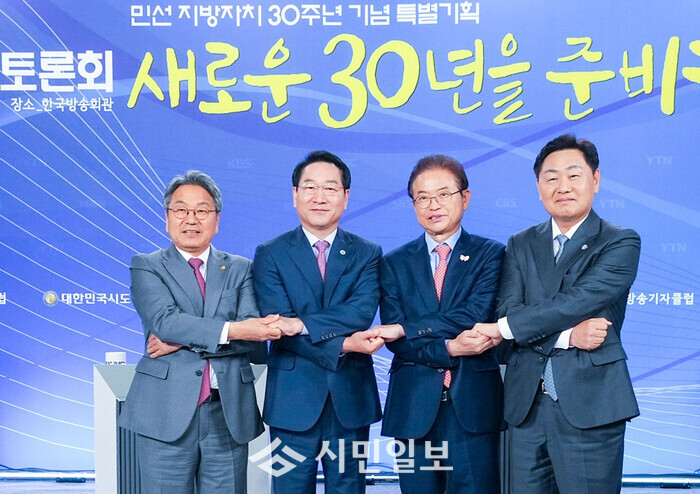 | ▲ 강기정 광주광역시장이 4일 오전 서울 한국방송회관에서 열린 ‘지방자치 30주년 시도지사 정책토론회’에 참석해 AI·에너지분권·균형발전 등 자립형 지방정부 모델을 제시한 뒤 기념촬영을 하고 있다. 왼쪽부터 유정복 인천광역시장, 강기정 광주광역시장, 김관영 전북특별자치도지사, 이철우 경북도지사./광주광역시 제공 |