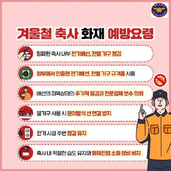 축사 주변 보온덮개, 스티로폼 등 가연물질은 안전한 장소로 이동하고, 소화기 등 소화설비 위치 확인 및 사용법 숙지, 자율안전점검표를 통한 주기적인 점검 등을 실시해야 한다.