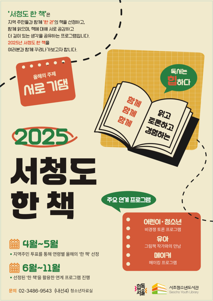 [시민일보 = 박소진 기자] 서울 서초구(구청장 전성수)의 서초청소년도서관에서 올해부터 주민과 함께 한 권의 책을 선정해 함께 읽고 생각과 경험을 나누는 ‘독서는 힙하다, 2025 서청도 한 책’을 추진한다고 23일 밝혔다.