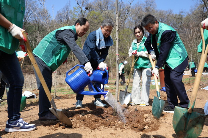 서울 구로구가 최근 장인홍 구청장을 비롯해 관계 공무원·근로자 등 200여명이 참석한 가운데 궁동에서 주민과 함께하는 ‘제80회 식목일 기념 나무심기 행사’를 개최했다. 참여자들은 2600제곱미터(㎡) 규모의 임야에 내화수종(산딸, 산수유, 마가목 등) 2300여 주를 식재했다. 사진은 장인홍 구청장(왼쪽 두 번째)이 주민들과 함께 나무를 심고 물을 주는 모습. (사진=구로구청 제공)