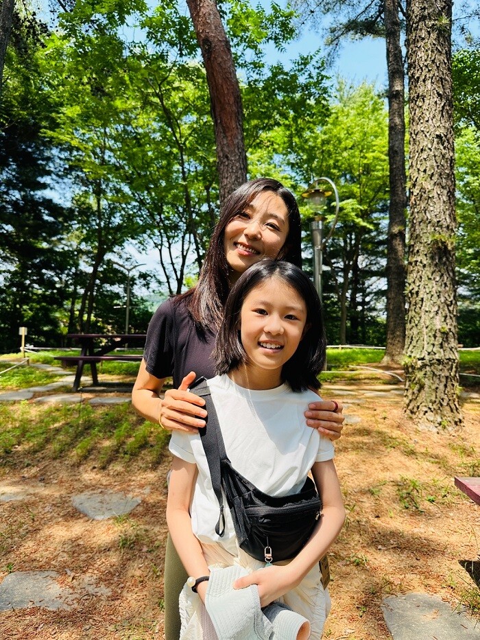 | ▲ 그린플로깅 참여 후 학내 플로깅서클을 만든 이엄지양(당진 삼봉초등학교 5학년)과 마운틴테라피를 진행하고 있는 워킹 인플루언서 김섬주가 기념촬영을 하고 있다. |
