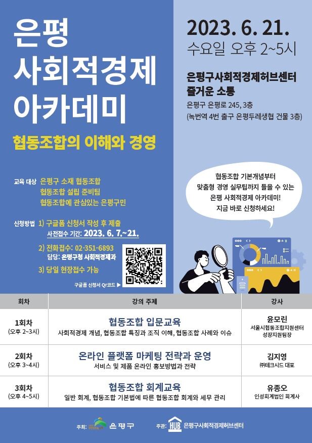 교육 신청은 오는 21일까지 홍보 웹자보의 QR코드를 통해 구글폼 신청서를 작성해서 제출하거나, 은평구청 사회적경제과 지역협동팀으로 전화 신청할 수 있다. 당일 현장 접수도 가능하다.