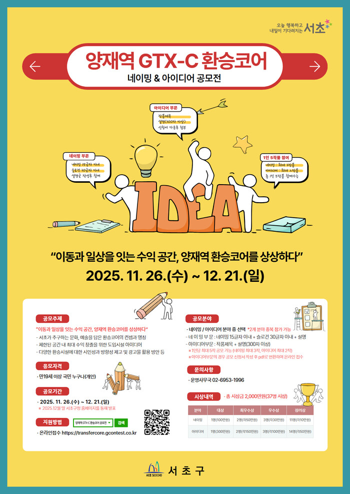 [시민일보 = 박소진 기자] 서울 서초구(구청장 전성수)는 양재역 일대 교통·생활 인프라를 유기적으로 연결하는 핵심시설인 ‘GTX-C 환승코어’를 더욱 창의적이고 매력적인 공간으로 조성하기 위해 ‘양재역 GTX-C 환승코어 네이밍&아이디어 공모전’을 개최한다고 2일 밝혔다.