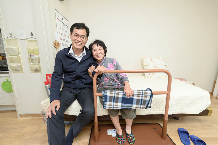 | ▲ 지난 달 어르신 안심 주거환경 개선사업 대상 가구를 직접 방문해 낙상예방물품(침대) 설치현황을 점검한 이기재 구청장(왼쪽). (사진=양천구청 제공) |
