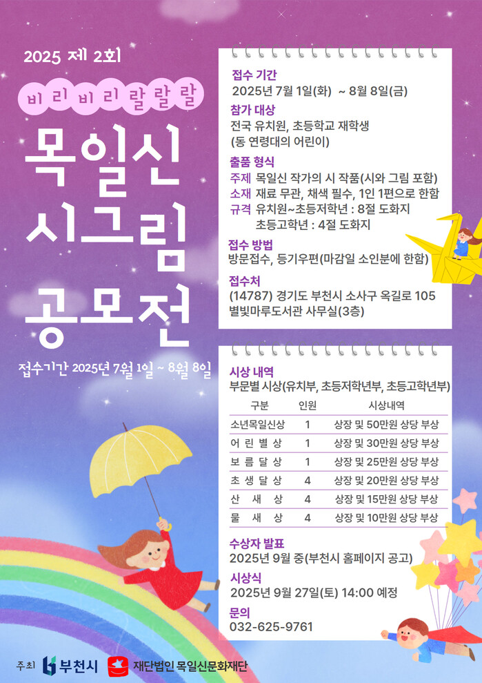 [부천=문찬식 기자] 경기 부천시는 재단법인 목일신문화재단과 함께 ‘2025년 제2회 목일신 시그림 공모전’을 개최한다고 22일 밝혔다.