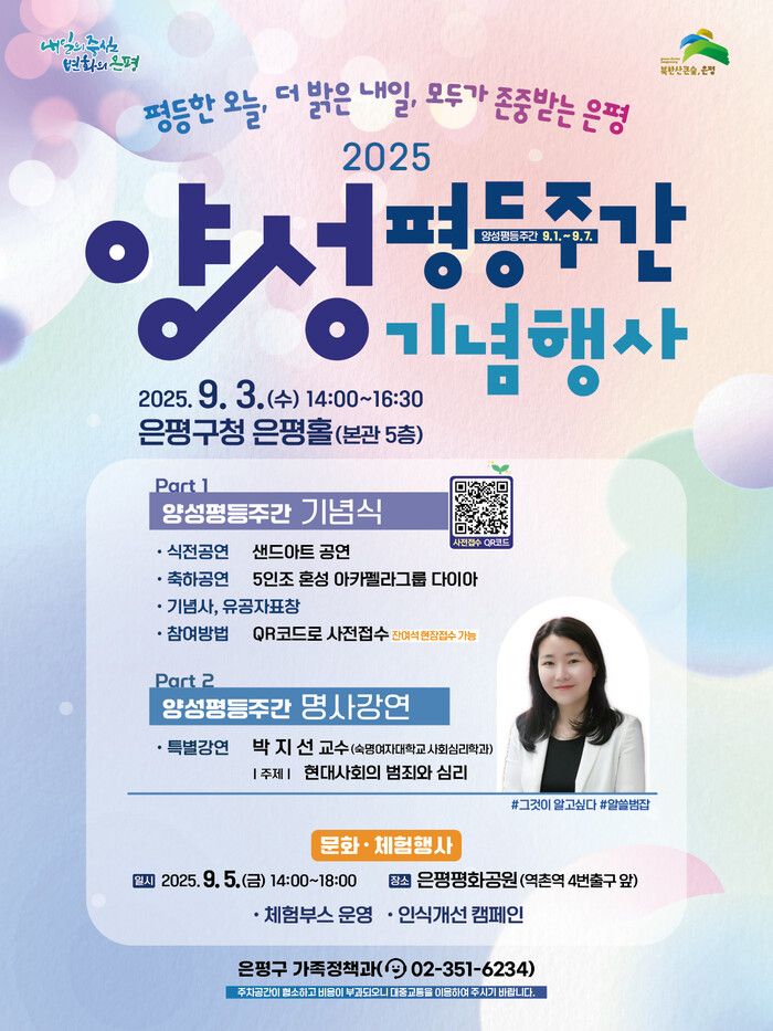 김미경 은평구청장은 “양성평등은 단순한 구호가 아니라 안전하고 행복한 일상을 가능하게 하는 기본 가치”라며 “이번 행사를 통해 구민 모두가 서로를 존중하며 성차별 없는 도시, 은평을 함께 만들어가는 계기가 되길 바란다”고 말했다.