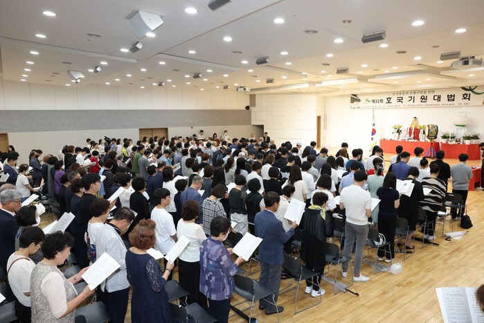 | ▲ 지난달 26일 불기2567년 6월 호국보훈의 달을 맞아 은평구청 은평홀에서 순국선열과 호국영령을 추모하기 위한 호국기원대법회를 열렸다.(사진=은평구청 제공) |