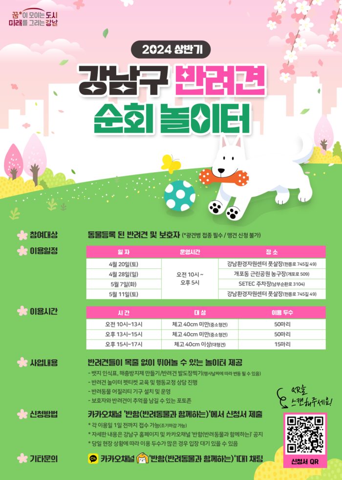 이용을 원하는 구민은 이용 전날까지 온라인으로 사전 예약하면 된다. 카카오 채널에서 ‘반함(반려동물과 함께 하는)’을 검색해 순회 놀이터 신청 링크를 클릭하거나 포스터에 있는 QR코드를 스캔해 신청서를 작성하면 된다.