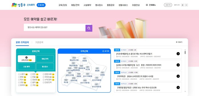 신속예약시스템은 구민정보화교육, 평생교육, 자치회관 교육 등과 성동글로벌체험센터, 아이사랑복합문화센터 등의 체험·견학 예약, 시설예약, 물품공유, 생활서비스, 각종 행사신청 등 다양한 다양한 분야에 대한 예약정보 및 사전예약 기능을 제공한다.