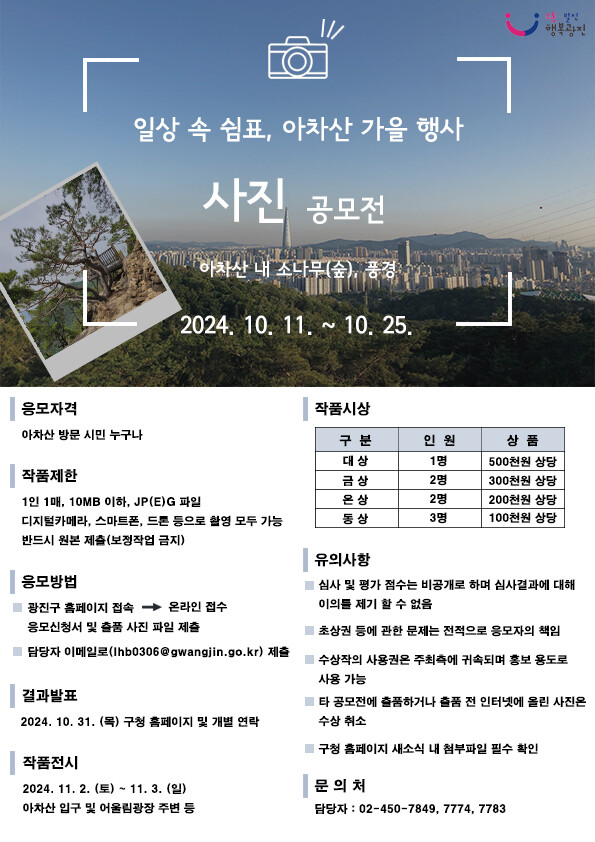 김경호 구청장은 “아차산의 아름다움을 널리 알리고 일상 속 건강한 여가 기회를 제공하고자 이번 사진 공모전을 마련했다”며, “아차산을 사랑하는 광진구민과 서울시민 여러분의 많은 관심과 참여를 바란다”고 말했다.