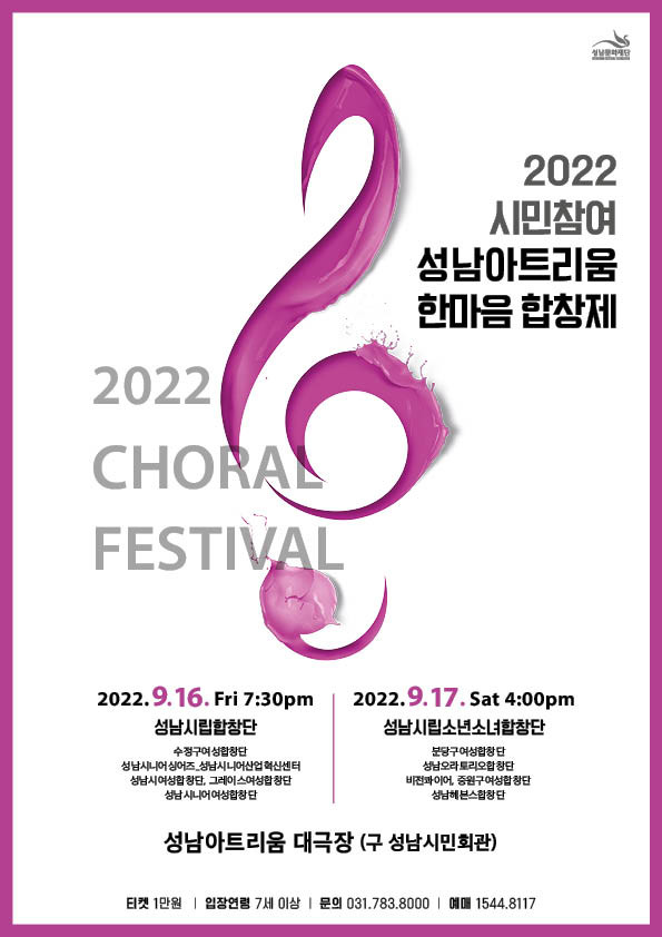 오는 9월 16일(금)~17일(토) 양일간 성남아트리움 대극장에서 열리는 이번 합창제는 성남시립합창단, 성남시립소년소녀합창단과 수정·중원·분당 여성합창단, 성남시 여성합창단을 비롯해