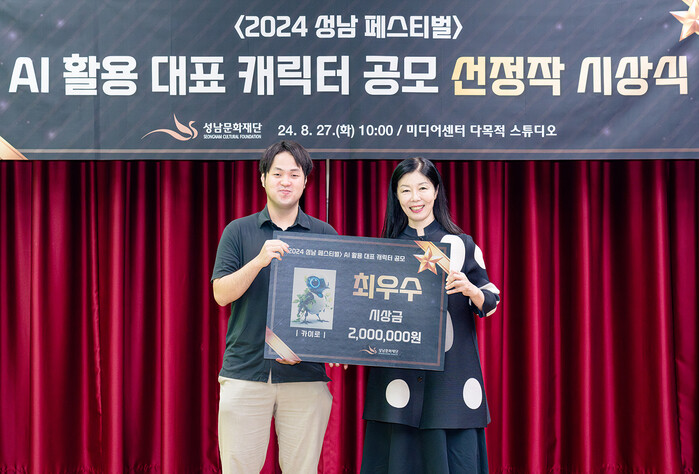 | ▲ 서정림 성남문화재단 대표이사(사진 오른쪽)와 AI 활용 대표 캐릭터 최우수 선정자 이기수씨 |