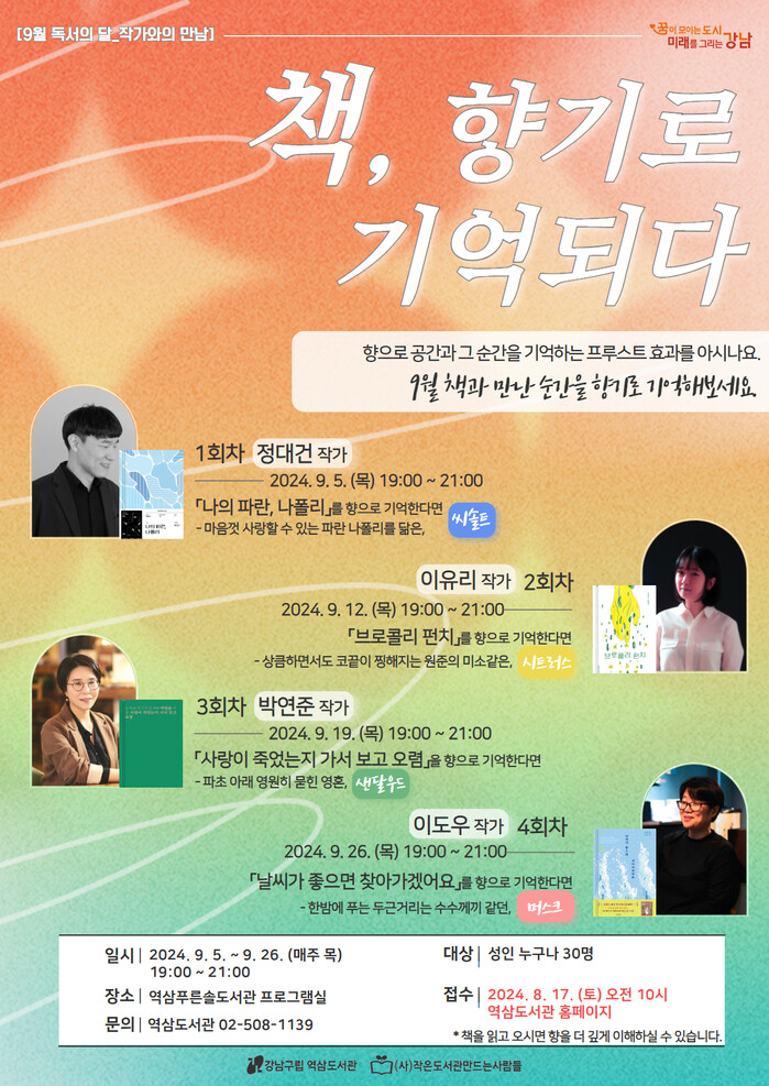 [시민일보 = 이대우 기자] 서울 강남구립 역삼도서관은 독서의 달을 맞아 오는 9월 5일(목)부터 9월 26일(목)까지 총 4회차에 걸쳐 <책, 향기로 기억되다>를 주제로 작가와의 만남을 진행한다.
