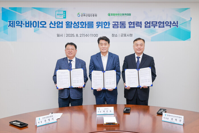 [군포=송윤근 기자] 경기 군포시가 27일 시청 회의실에서 군포산업진흥원, 청람바이오아카데미와 제약ㆍ바이오ㆍ헬스케어 산업 활성화 및 지역 인재 양성을 위한 3자 업무협약을 체결했다.