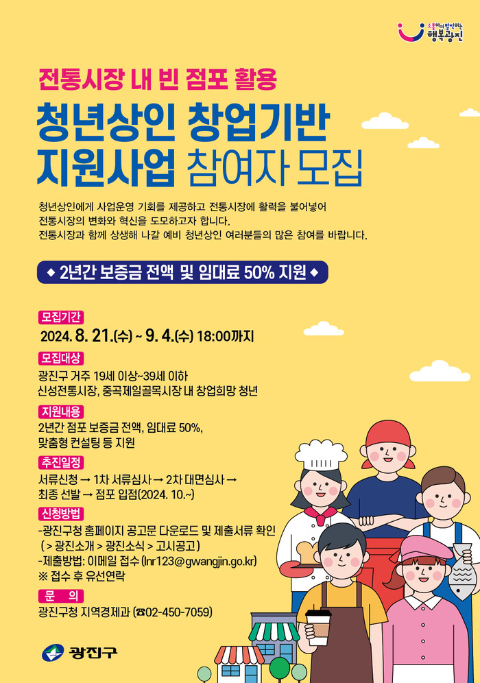 구에 따르면 이번 사업은 청년상인에게는 사업운영 기회를 제공하고 전통시장에는 젊은 활기를 불어넣어 변화와 혁신을 유도하기 위해 추진되는 사업이다. 신성전통시장 4곳과 중곡제일골목시장 1곳, 총 5곳에 빈 점포의 주인을 찾는다.