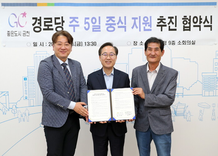 | ▲ 지난 10일 유성훈 금천구청장(사진 가운데)이 ‘경로당 주 5일 중식 지원 추진 협약식’을 마치고 김선웅 금천시니어클럽 관장(사진 왼쪽), 이정일 금천지역자활센터장(사진 오른쪽)과 기념촬영을 하고 있다 (사진=금천구청 제공) |
