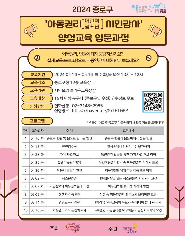 참여 대상은 아동 권리에 관심 있는 19세 이상 종로구민이다.