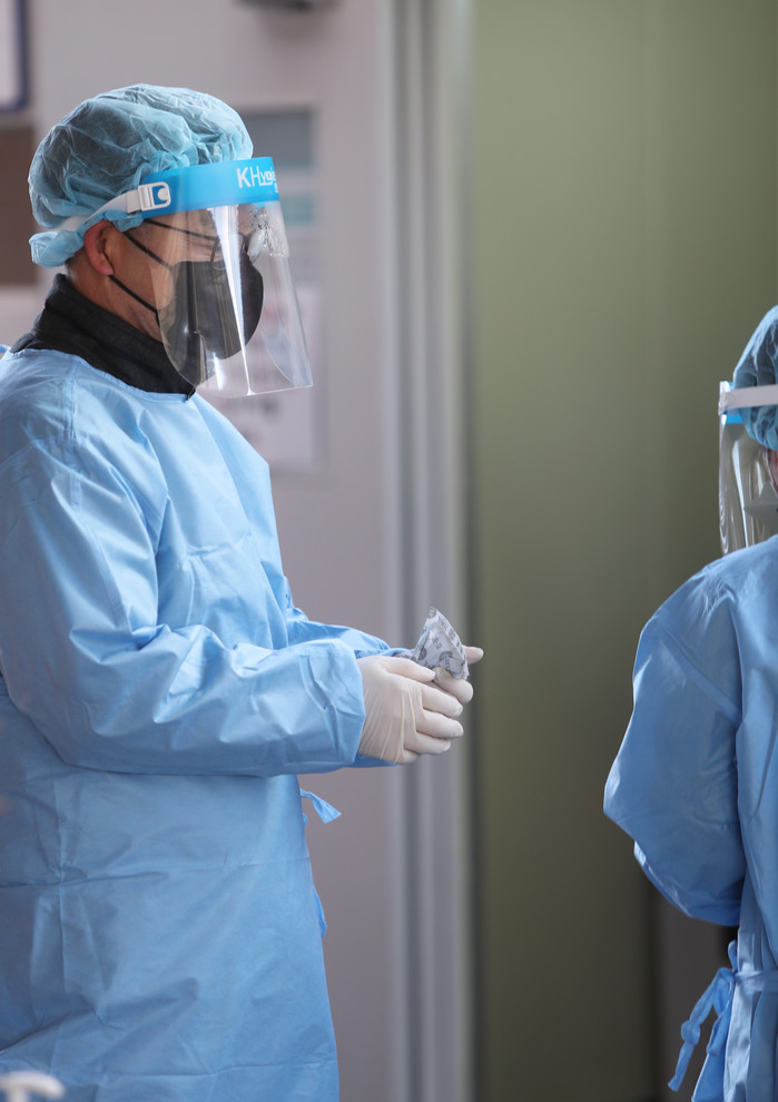 13일 오전 전북 완주군 삼례읍 완주군보건소 선별진료소에서 공무원들이 핫팩을 들고 손을 녹이고 있다.