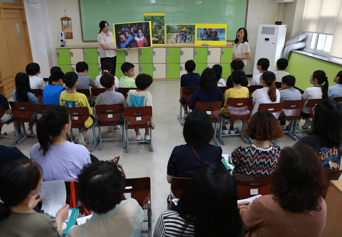 28일(금), 탄천초등학교(교장 권경희)에서 진행한 이날 수업나눔에는 지역의 교원들과 예술강 사 등 50여 명이 참석했다. 초등 5학년 교과 내용 중 ‘나의 인권, 세상 속에 있다’는 주제로 교사와 예술강사가 팀티칭으로 진행하는 교육연극 수업을 참관하고 의견을 나누는 협의회를 진행했다.