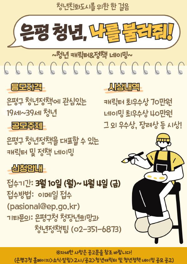공모전은 ’청년의 상상, 은평을 물들이다‘를 주제로 은평구 청년을 상징하는 캐릭터 디자인과 은평 청년정책의 정체성을 알기 쉽게 잘 표현한 공감되는 청년정책 네이밍을 공모한다.