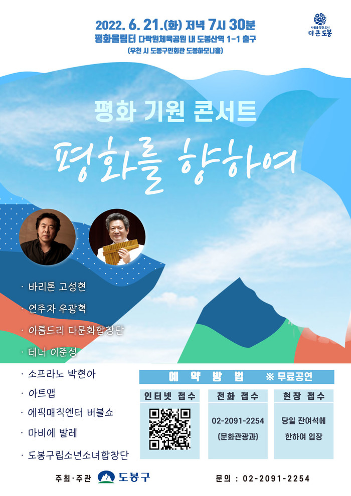 [시민일보 = 박준우 기자] 서울 도봉구가 오는 21일 오후 7시30분 평화울림터(평화문화진지 옆, 도봉동1-8)에서 '평화 기원 콘서트'를 개최한다.