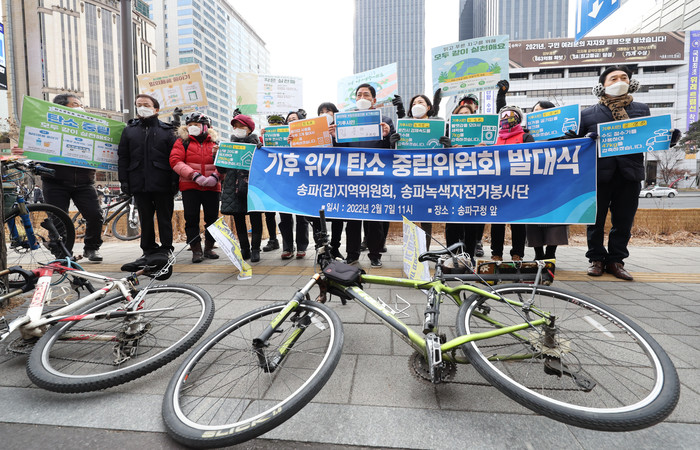 7일 오전 서울 송파구청 앞에서 녹색자전거봉사단연합 회원들이 송파구 탄소중립위원회 발대식을 하고 있다.