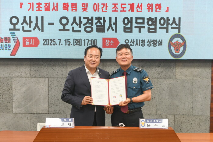 시와 오산경찰서는 15일 시청 상황실에서 ‘야간 조도 개선 업무협약’을 체결하고, 어두운 골목길과 범죄 취약지역의 조도를 집중 개선해 범죄를 예방하고 시민 불안을 해소하기로 했다.