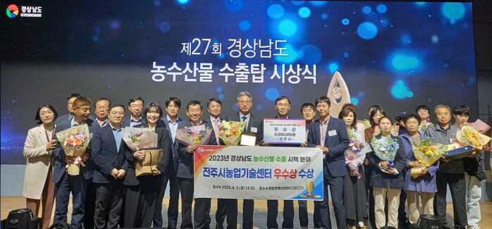 진주시는 3일 창원컨벤션센터(CECO)에서 관계자 250여 명이 참석한 가운데 열린 제27회 경상남도 농수산물 수출탑 시상식에서 농수산물 수출 시책평가 부문 ‘우수상’ 수상의 영예를 차지했다. 또한 3개 수출단체와 33명의 수출 농업인이 수출탑을 수상했다.