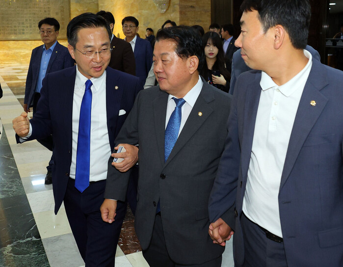 반면 민주당 박찬대 대표 직무대행 겸 원내대표는 이날 국회 본청에서 열린 최고위원회의에서 "잘못은 누가했나. 국민의힘은 지난달 2일 공식 논평에서 '한미일 동맹'을 공식 용어로 사용했다"며 "한미동맹은 존재해도 한미일 동맹이나 한일 동맹은 존재하지 않는다"고 김 의원을 두둔했다.