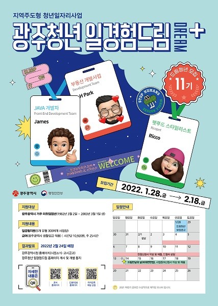 이에 따라 광주시는 2월3일부터 18일까지 ‘광주청년 일경험드림+’ 사업에 참여할 11기 청년을 모집한다. 대상은 1982년 3월2일생부터 2003년 3월1일생까지의 미취업 청년이다.