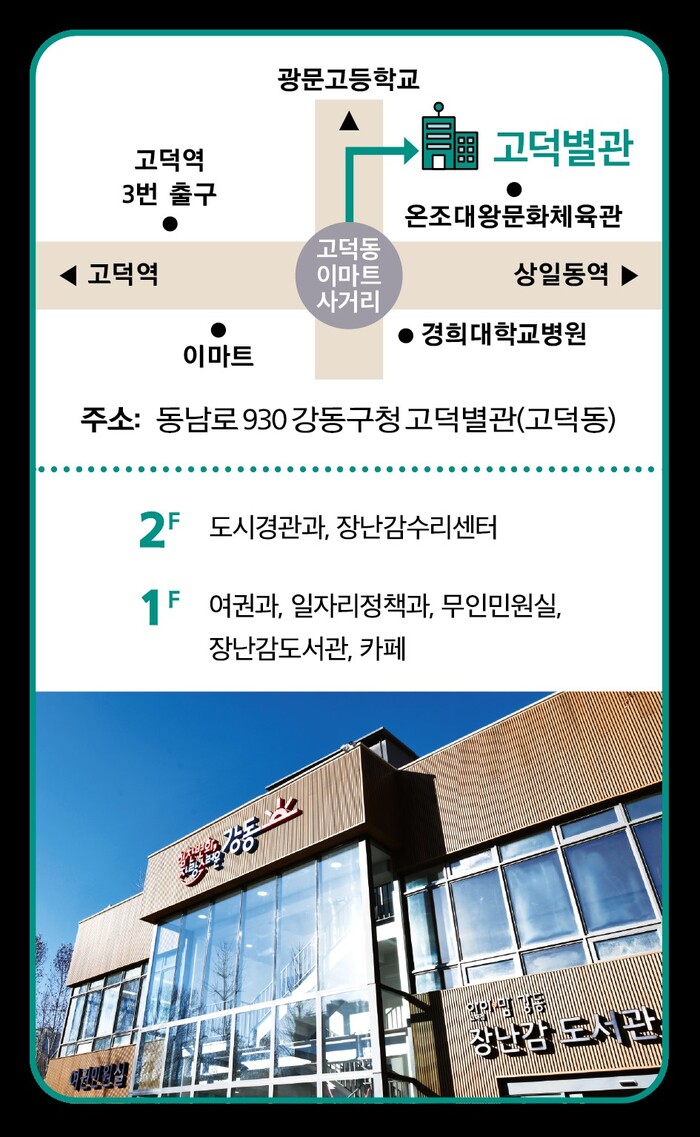 새롭게 조성된 강동구청 고덕별관은 공실로 방치된 (舊)리사이클시티 건물을 증·개축해 지상1층에는 ▲여권과 ▲일자리정책과 사무실(일자리센터) ▲장난감도서관 ▲무인민원실 ▲장애인일자리카페가 자리 잡았고, 지상 2층에는 도시경관과 사무실과 장난감 수리센터 등이 마련돼 있다.
