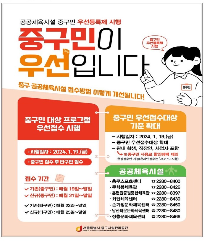 [시민일보 = 여영준 기자] 서울 중구(구청장 김길성)가 지역주민이 보다 편안하게 공공체육시설을 이용할 수 있도록 조례를 개정해 ‘공공체육시설 중구민 우선 등록제’를 실시한다.