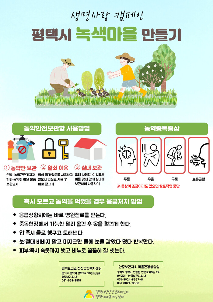 이에 안중보건지소는 ‘생명사랑 캠페인’으로 ▲올바른 농약 보관함 사용법(보관함에는 농약만 보관, 잠금장치 관리, 실내 보관) ▲음독사고 발생 시 올바른 신고 요령 및 응급처치법 교육 ▲두통, 구토, 호흡곤란 등 농약 중독 증상 ▲우울 선별 검사를 통한 고위험군 발굴 ▲자살예방센터 홍보 등을 진행했다.