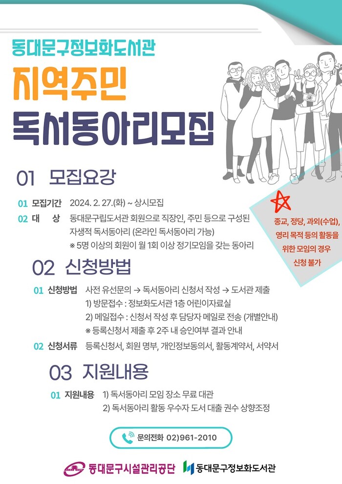 동대문구립도서관 회원으로 가입된 직장인·지역주민 등 5명 이상의 구성원이 대상이며, 월 1회 이상 정기적으로 독서모임을 갖는 독서동아리라면 신청할 수 있다.