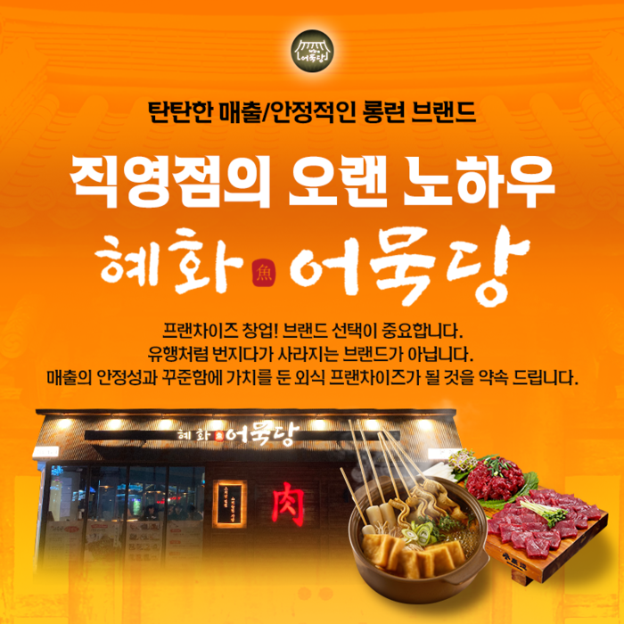 혜화어묵당은 남녀노소가 좋아하는 대중적인 음식인 어묵과 육회를 메인 메뉴로 내세우고 있다. 부산 수제어묵과 국내산 한우 냉장육회를 사용하여 맛과 퀄리티를 모두 높였으며, 여기에 안주 메뉴부터 야식, 식사까지 가능한 서브 메뉴를 구성해 다양한 고객층의 유입을 이끌어내고 있다.