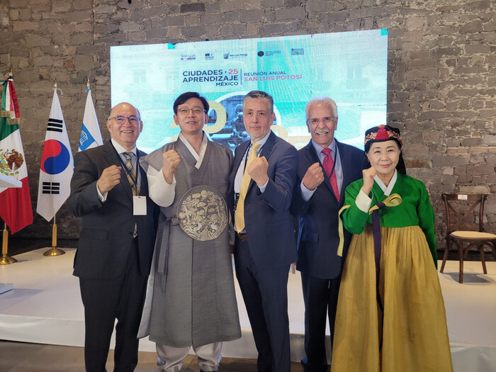 현근택 경기 수원시 제2부시장이 최근 ‘2025 멕시코·라틴아메리카 유네스코 학습도시연맹 콘퍼런스’에서 평생학습을 바탕으로 추진한 기후행동과 탄소중립 실천 우수사례를 발표했다. 사진은 현 제2부시장(왼쪽 두 번째)이 관계자들과 기념 촬영하는 모습. (사진=수원시청 제공)