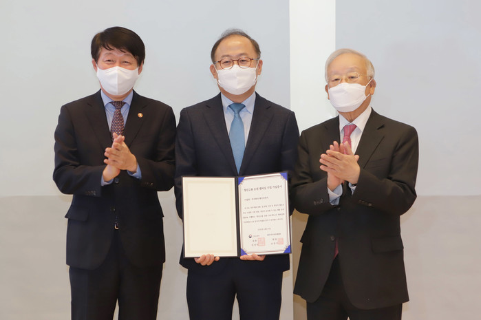 | ▲ 지난 16일 KT&G상상플래닛에서 열린 ‘청년고용 응원 컨퍼런스’에서 이상학 KT&G 지속경영본부장(가운데)이 안경덕 고용노동부 장관(왼쪽), 손경식 한국경영자총협회 회장(오른쪽)에게 멤버십 가입증서를 받고 기념촬영을 하는 모습. (사진제공= KT&G) |
