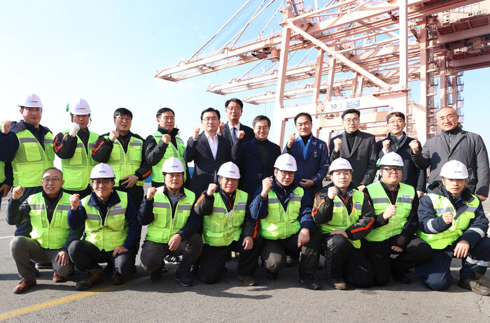 [평택=오왕석 기자] 김동연 경기도지사와 정장선 평택시장이 지난 1월 1일 평택항 첫 수출 현장을 방문해 항만노동자와 관계자들을 격려했다.