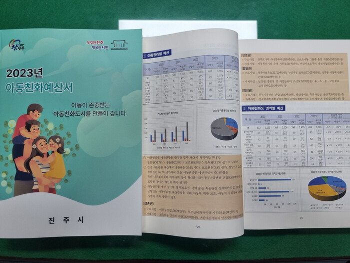 올해 진주시 아동친화사업 예산 규모는 총 3369억 원으로 지난해 2835억 원보다 534억 원 증액하였고, 이는 진주시 전체 예산 1조 5292억 원(일반회계 기준)의 22%를 차지하고 있다. 이 비율을 보면 진주시가 아동친화정책 추진을 위해 많은 노력을 기울이고 있음을 알 수 있다.