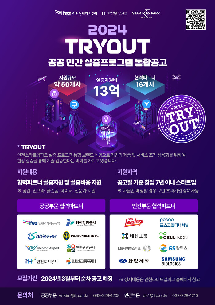 [인천=문찬식 기자] 인천경제자유구역청과 인천테크노파크는 올해 ‘인천스타트업파크 트라이 아웃(TRY OUT)’에 참여할 스타트업을 모집한다고 27일 밝혔다.
